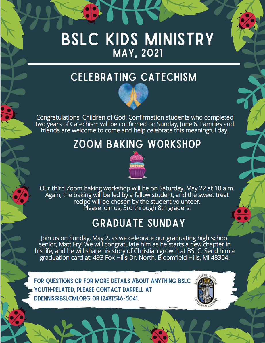 BSLC Kids Ministry May NewsletterscrogijoMay 1, 20211 min readUpdated: May 27, 2021BSLC Kids Ministry May 2021 (3).pdfDownload PDF • 1.82MBRSVP for the BSLC Baking Workshop and get cooking!If you have any questions, please contact us atoffice@bslcmi.org248-646-5041